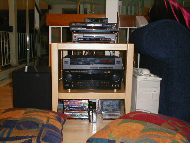 from top to bottom: Clearmax 3000 cable descrambler.Aiwa 370 DVD.Panasonic VCR.Old CD Player.Teac Dolby DTS digital receiver. Subwoofer to the left. a ground rumbler hidden from view. and Home theater PC to the right.